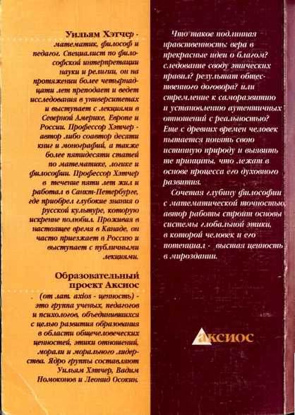 В представленной здесь небольшой, но дающей много пищи для размышления работе, профессор Уильям Хэтчер сочетает лучшие черты археолога, каким является Макинтайр, и художника, представленного Пулом. Исходя из положений, содержащихся в своих ранее вышедших книгах «Логика и Логос» и «Всеобщий закон любви», автор опирается на достижения науки, философии и религии, чтобы дать определение морали и морального развития, основанное на определенных заключениях относительно реальности и на понимании того, что постижение добра всегда должно представлять собой акт творческого открытия.