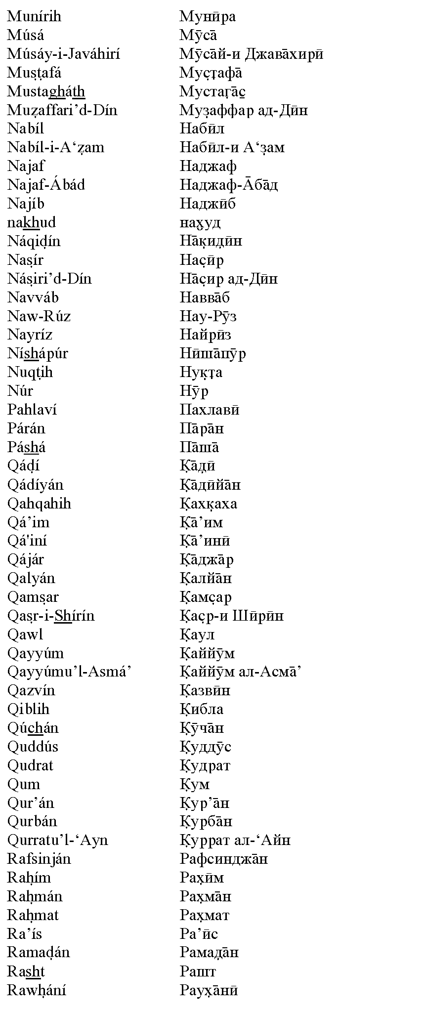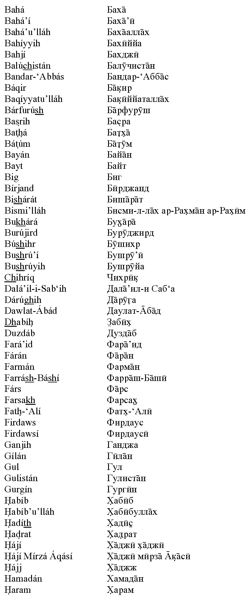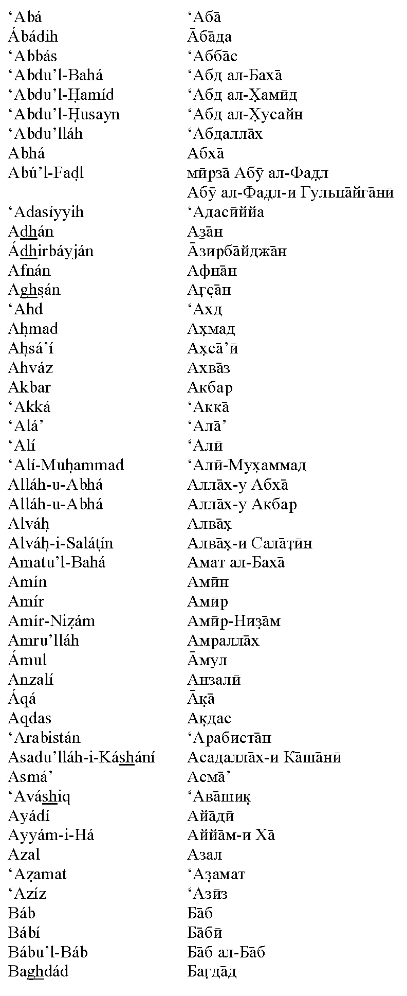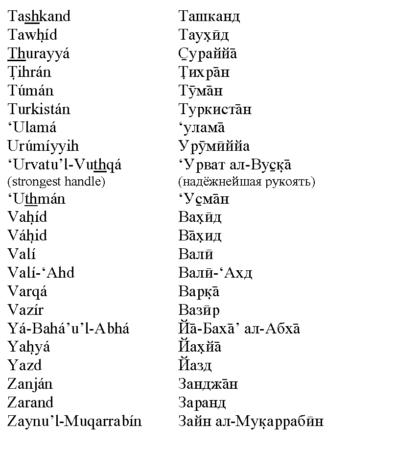 Ещё в начале XX века Шоги Эффенди, Хранитель Веры Бахаи, увещевал всех верующих использовать при написании персидских и арабских имён и терминов систему транслитерации. Сам он выбрал такую систему для латиницы, а вопрос с другими алфавитами остался открытым. Полное обсуждение данного вопроса, со всеми цитатами, вы можете скачать в виде PDF-файла или в виде файла MS Word с внедрёнными шрифтами.